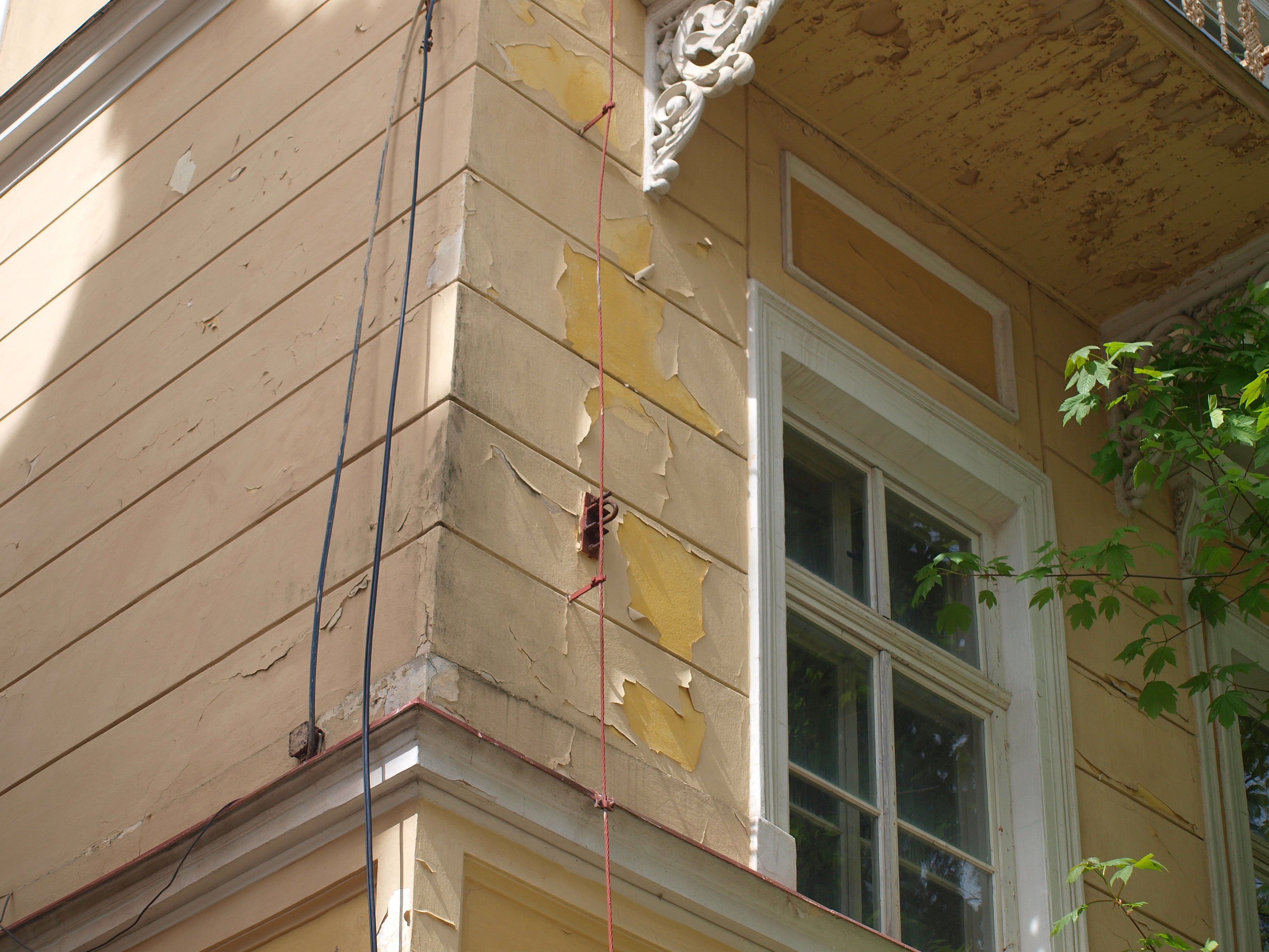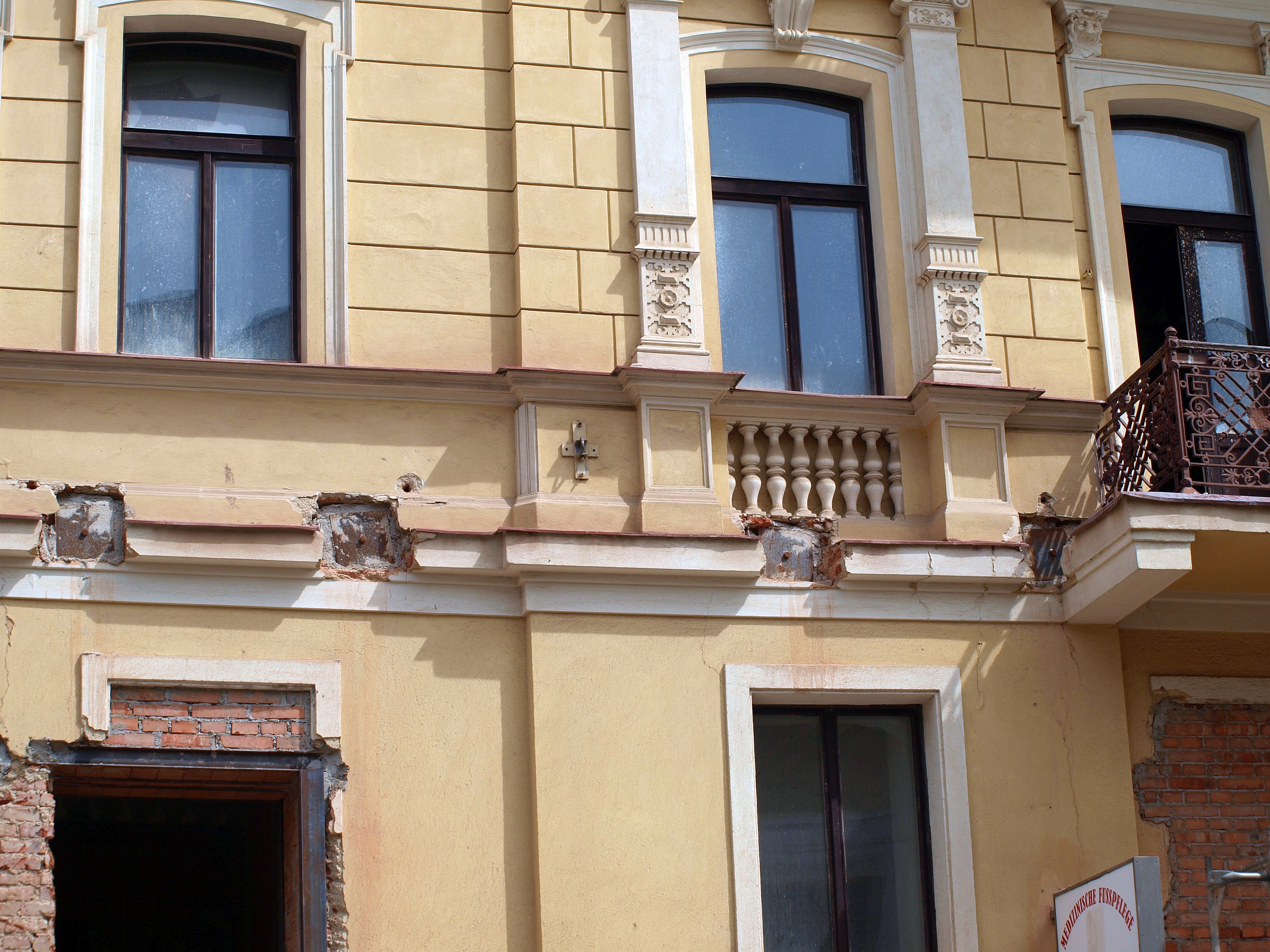 Výběr z mnoha úchytů převěsů trolejového vedení, které jsou dosud patrné prakticky na všech okolních domech v ulici Třebízského.